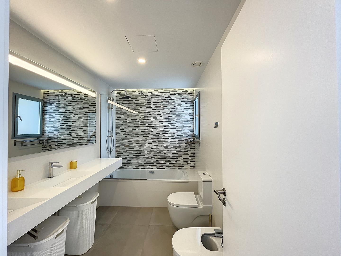 De villa is afgewerkt volgens een zeer hoge standaard en is uitgerust met vloerverwarming, gekanaliseerde airconditioning via een gelijktijdig MITSUBISCHI ELECTRIC® airconditioning en warm water productiesysteem op basis van een externe warmtepomp met een hoog energierendement.