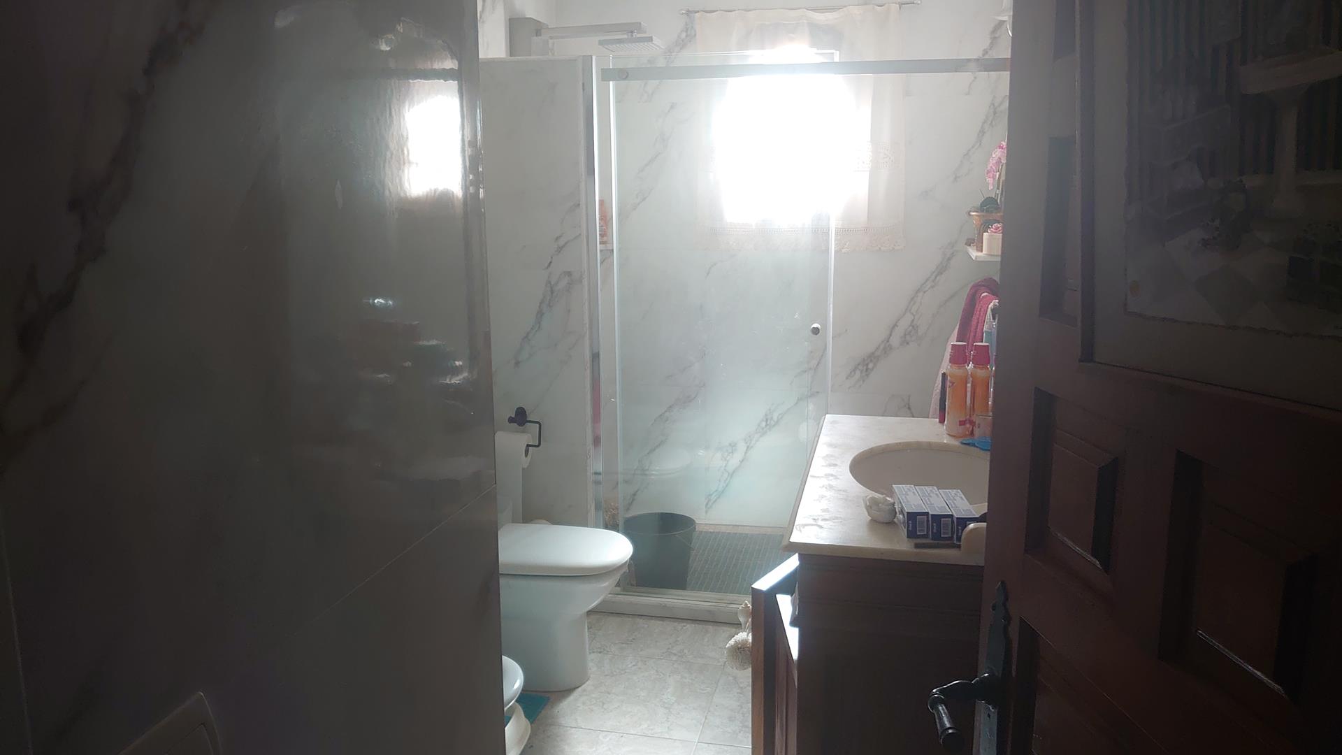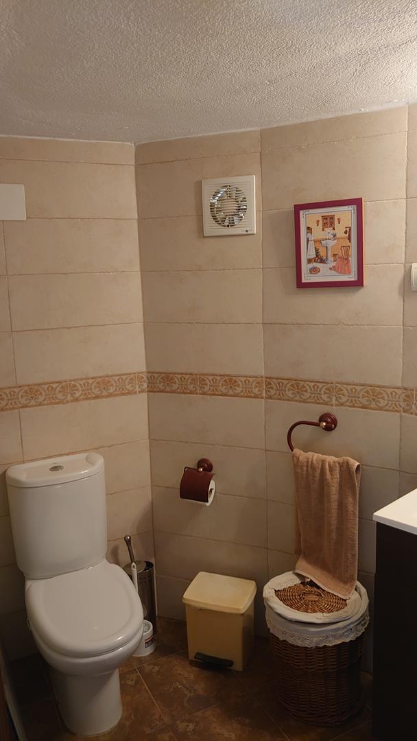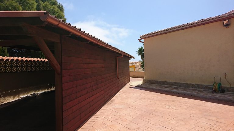Via de buitentrap gaan we naar beneden naar het terras en de toegang tot de barbecueplaats en het zwembad van 5 x 10, aan één kant van het terras hebben we toegang tot de berging met badkamer.